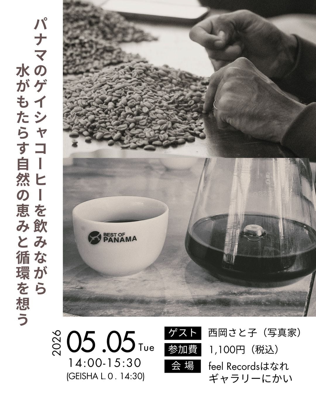 14:00-14:30の間に1Fのカフェスペースでコーヒーの提供を、以降は2Fのギャラリースペースでトークイベントを開催いたします。パナマコーヒーをきっかけに現地の写真や自然のめぐみや循環に想いを馳せる時間になりましたら幸いです。